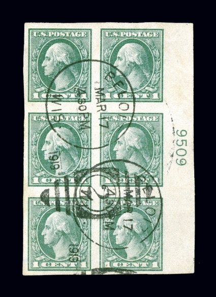 145 OPB 531 image#531, 1c Green offset imperforate, lovely used right margin plate no. 9509 block of six, with two clear strikes of Beloit, Wis. duplex dated March 17, 1919, the earliest documented usage of this stamp on or off cover, this value is reported to have been issued some time in January of 1919 and the block offered here predates the earliest documented usage cover by three weeks, trivial thin spot, otherwise extremely fine; clear 2003 APS certificate; ex-Wagner. (Image) Est. 500-750