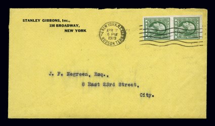 146 c 531 image#531, 1c Green offset imperforate, vertical pair paying the 2c wartime drop letter rate, tied to Stanley Gibbons, Inc. of New York corner card cover by New York, N.Y. Hudson Terminal Station machine cancel, April 7, 1919 earliest documented usage on cover, posted within the city, backflap missing, otherwise very fine; 2004 APS certificate. (Image) Est. 750-1,000