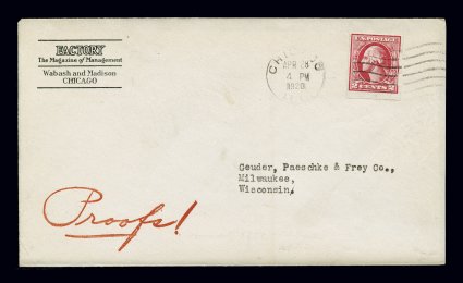 147 c 532 var. image#532 var., 2c Carmine rose offset imperforate, Ty. IV, Shermack Ty. III perforations, fresh single with margins all around, tied to Factory, The Magazine of Management, corner card cover by Chicago, Ill. machine cancel, April 28, 1920 earliest documented usage for this stamp with Shermack Ty. III perforations, cover is attractive and fresh, marked "Proofs" and probably being sent to an advertiser in the magazine, very fine; 2003 APS certificate. (Image) Est. 500-750