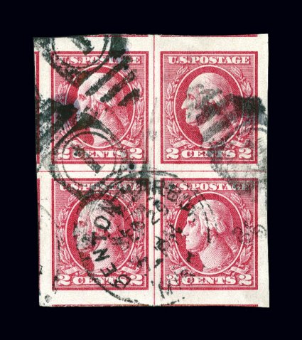 148 Obl 533 image#533, 2c Carmine offset imperforate, Ty. V, used center line block of four possessing absolutely immense margins all around showing small portions of adjoining stamps on three sides, cancelled with portions of duplex handstamp with a full c.d.s. of Benton Harbor, Mich., dated September 29, 1920, the earliest documented usage of this scarce type; extremely fine; an extremely scarce used center block in its own right, but especially desirable in this choice condition as the earliest documented usage; 2003 APS certificate; ex-Wagner. (Image) Est. 750-1,000