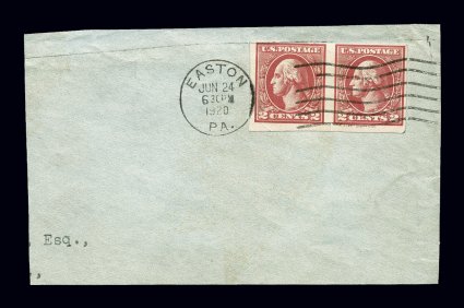 149 O 534 image#534, 2c Carmine offset imperforate, Ty. Va, horizontal pair, tied to piece by clear Easton, Pa. machine cancel, dated June 24, 1920, the earliest documented usage, a very early date for this being less than a month from the date that the earliest plate of this type was certified, fine; 2005 APS certificate. (Image) Est. 750-1,000