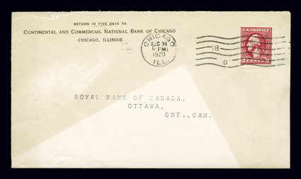 150 c 534A image#534A, 2c Carmine offset imperforate, Ty. VI, Shermack Ty. III perforations single applied by affixing machine to Continental and Commercial National Bank of Chicago corner card cover, August 31, 1920 earliest documented usage as both the sheet stamp and with this vending machine perforation with full Chicago, Ill. machine cancel of that date neatly tying the stamp, 2c treaty rate cover to Ottawa, Ontario, Canada, uneven aging to cover, otherwise a very fine and early cover; the earliest plate that produced this imperforate was certified on July 26, 1920. (Image) Est. 1,000-1,500