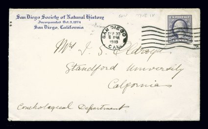 151 c 535 image#535, 3c Violet offset imperforate, Ty. IV, handsome four-margin single tied to attractive corner card cover of the San Diego Society of Natural History, September 30, 1918 earliest documented usage with strong San Diego, Cal. machine cancel of that date tying the stamp, very fine and an exceedingly choice earliest documented usage; 2003 APS certificate. (Image) Est. 1,000-1,500