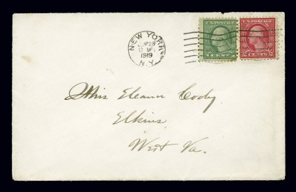 152 c 538 image#538, 1c Green coil waste, perf. 11x10, single plus 2c Carmine (#540) also of the coil waste issues, both with typical fine centering, tied to non-philatelic cover to West Virginia paying the 3c letter rate, June 28, 1919 earliest documented usage with stamps tied by New York, N.Y. machine cancel, very fine cover; an early date for this earliest documented usage with Johl listing June 14, 1919 as the date of issuance; 1995 APS certificate. (Image) Est. 1,000-1,500