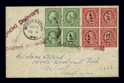 153 c 538a, 540a image#538a, 540a, 1c Green and 2c Carmine rose, vertical pair, imperforate horizontally, two pairs of each in quite well centered blocks of four, the 1c block is a bottom margin block, tied to special delivery cover by portions of Middletown, Pa. duplexes and the "Special Delivery" handstamps, September 5, 1927 earliest documented usage for both stamps, backstamped Detroit, Michigan the next day, very fine and attractive cover; when these coil waste issues were first issued some had no horizontal perforations between the top row and the selvage, because these were popular with collectors an order was made to produce some more of these, this order was misunderstood to mean completely imperforate horizontally, thus this variety came about and was virtually all saved by collectors mint, because they are so scarce used at the time caution must be used in obtaining contemporaneous cancels, covers with either value are very rare and a cover, such as this, with both values in blocks of four being the earliest documented usage is a find indeed. (Image) Est. 2,000-3,000