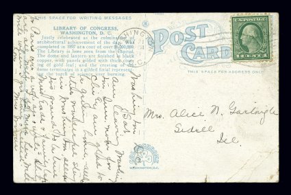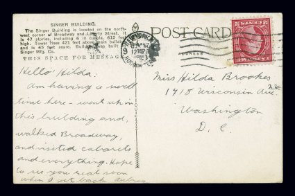 155 c 540 image#540, 2c Carmine rose coil waste, Ty. III, perf. 11x10, attractive single on multicolor view card to Washington, D.C. paying the 2c post card rate, June 17, 1919 earliest documented usage with the stamp tied by New York, N.Y. Hudson Terminal Station machine cancel of that date, very fine; it is quite likely that an earlier date will never be found as this June 17th date is incredibly early being a mere four days after the June 14th date listed for this by both Scott and Johl; a marvelous rarity for the Washington-Franklin specialist or earliest documented usage collector; 2004 APS certificate. (Image) Est. 1,500-2,000