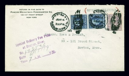 156 c 541 image#541, 3c Violet coil waste, fine single of this coil waste issue along with very fine vertical pair of 5c Blue (#504), tied to special delivery corner card cover of Powers-Weightman-Rosengarten Co. to Boston, June 14, 1919 First Day Cover, also being the earliest documented usage as no predated covers are known, stamps are tied by two strikes of a New York, N.Y Hudson Terminal Station duplexes, backstamped in Boston the next day, exceptionally clean commercial usage and a choice very fine cover.The coil waste issues are one of the few issues of the Washington-Franklin series where a specific date is listed for their issuance. Max Johl in his comprehensive work on "United States Postage Stamps 1902-1935" lists June 14, 1919 in both his introduction to the Washington-Franklin series as well as for each of the values of this series (#538-41) as the date of issuance. Furthermore, Scott uses this date as the date of issuance and lists #541 in the First Day Cover listing (unpriced) and specifically notes in citing this date as the earliest documented usage that it is a FDC.The other coil waste values are not listed as first day covers because none are known used as early as the day of issuance. The cover offered here is the unique example of the Three Cent Violet Coil Waste Issue, Type II, perforated 11x10, being the only first day cover known for this value or the entire coil waste series. A must for the collector trying to complete a collection of first day covers of the 20th century; 2002 APS certificate. (Image) Est. 7,500-10,000