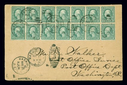 157 c 542 image#542, 1c Green coil waste, perf. 10x11, an impressive block of fourteen (7x2) being especially well centered for such a large multiple, just tied to First Day Cover by Washington, D.C. duplexes, May 26, 1920 earliest documented usage, another of the few Washington-Franklin issues where the first day of issuance is listed and acknowledged by Scott, this cover was serviced by Henry Hammelman and posted to L. Walker in the Post Office Department in Washington, D.C. with that city's special delivery duplex on the reverse, very fine; this is the largest known used multiple on or off cover; Scott value for single on FDC $1,750.00; 1988 AFDCS certificate. (Image) Est. 2,000-3,000