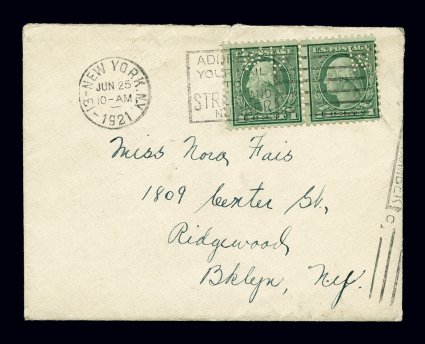 159 c 545 image#545, 1c Green coil waste, perforated 11, horizontal pair with typical fine centering and with commercial perforated initials "WU" to prevent illicit usage, but used on small lady's cover with personal enclosure to Brooklyn, June 25, 1921 earliest documented usage with New York, N.Y slogan machine cancel of that date, very fine cover; the perforated 11 coil waste issues are much scarcer than the earlier issues perforated 11x10, so much so that any 1c usage is rare; this early date has long been recognized as the earliest documented usage since its discovery in 1988; woefully undervalued on cover in Scott as it is believed by specialists that there are less #545 covers in existence than #544 covers; signed Siskin and accompanied by 1987 PF certificate. (Image) Est. 4,000-5,000
