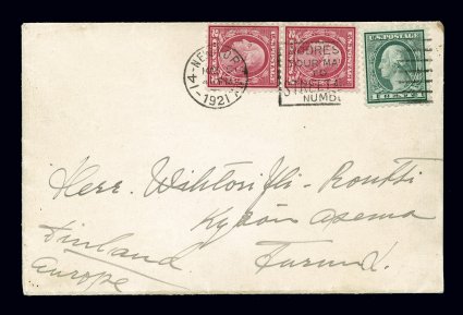 160 c 546 image#546, 2c Carmine rose coil waste, Ty. III, perforated 11, lovely vertical pair being wonderfully well centered for this difficult issue, accompanied by 1c Green (#542) on neat cover to Finland, all tied by New York, N.Y. slogan machine cancel, this being the May 5, 1921 earliest documented usage, very fine and a remarkably choice usage; an amazingly early cover as Johl lists May as the issuance month, it is hard to get much earlier than the 5th and this cover has withstood the test of time since December 1988; signed Siskin and accompanied by 1994 PF certificate; ex-Hadley. (Image) Est. 2,000-3,000