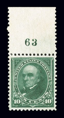 385 nh 273 image#273, 10c Dark green, a most attractive top margin plate no. 63 single, exceptionally well centered within large margins, beautiful rich color and a crisp detailed impression, unblemished o.g., n.h., extremely fine; 1987 and 2001 PF certificates, as well as a 2005 PSE certificate. (Image) $260.00