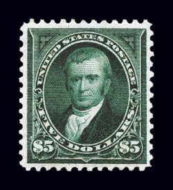 391 og 278 image#278, $5.00 Dark green, an impressive mint example of this very scarce high value, possessing far better centering than normally encountered, plus its color is sumptuously rich and its impression deeply etched, o.g., lightly hinged, extremely fine; 1996 PF and 2005 PSE certificates. (Image) $2,300.00
