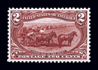 400 nh 286 image#286, 2c Trans-Mississippi, a beautiful mint single, possessing stunning color that is incredibly deep and rich, a vivid impression on bright white paper, exceptionally well centered within large margins, immaculate o.g., n.h., an extremely fine and eye-appealing gem; 2001 PF certificate and a 2005 PSE certificate (XF 90). (Image) $65.00