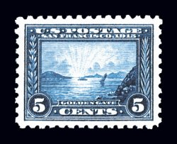 485 og 403 image#403, 5c Panama-Pacific, perf. 10, extraordinarily well centered within especially large margins, incredibly vivid color and a prooflike impression on immaculate white paper, o.g., faintly hinged, extremely fine; a stamp with great eye appeal; 2003 PF certificate and a 2002 PSE certificate (XF-Superb 95). (Image) $175.00