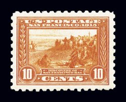 482 nh 400A image#400A, 10c Panama-Pacific, orange, wonderfully bright rich color and a clean impression on pristine white paper, exceedingly well centered within large margins, immaculate o.g., n.h., extremely fine gem; 2003 PSE certificate (XF 90). (Image) $475.00