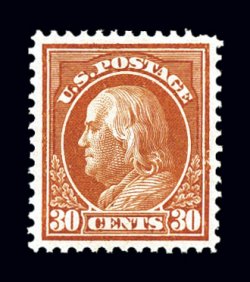 496 nh 420 image#420, 30c Orange red, well centered, deep rich color on fresh white paper, o.g., n.h., perforation at top right has become shorter since the issuance of the certificate, choice very fine; clear 2001 PF certificate (bottom selvage subsequently removed). (Image) $260.00