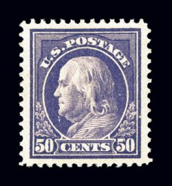 497 og 421 image#421, 50c Violet, single line watermark, outstanding centering within particularly wide margins, sumptuously rich color and a highly detailed impression on crisp white paper, o.g., lightly hinged, extremely fine and uncommonly choice; 1999 PF certificate (bottom selvage subsequently removed) and a 2003 PSE certificate (XF-Superb 95). (Image) $425.00