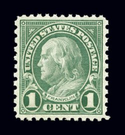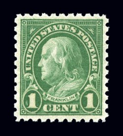 578 nh 581 image#581, 1c Green, near perfect centering within balanced margins all around, deep color and an intense impression, pristine o.g., n.h., an extremely fine gem; a surprisingly challenging stamp to find so choice; 2005 PSE certificate (XF-Superb 95). (Image) $22.50