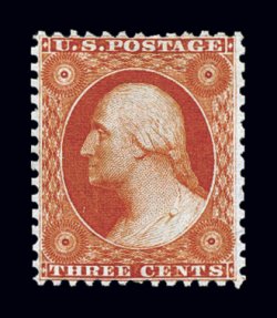 223 og 41 image#41, 3c Scarlet reprint, without gum as issued, uncommonly well centered for this value, deep vibrant color and a highly detailed impression on fresh paper, very fine; only 479 sold; 1968 and 1992 PF certificates, and a 2005 PSE certificate (F 70); ex-Chanin. (Image) $3,250.00