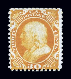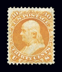 237 og 71 image#71, 30c Orange, lovely bright color and an uncommonly crisp impression, very well centered within uncharacteristically large margins (perforations clearing the design all around), full o.g., minor h.r., very fine; a scarce mint stamp, particularly in this quality; 2004 PSE certificate (VF 80). (Image) $2,000.00