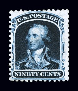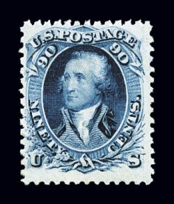 221 og 39 image#39, 90c Blue, exceedingly well centered amid large and wonderfully well balanced margins, deep luxuriant color and a razor-sharp impression, full o.g., lightly hinged, an extremely fine gem; premium quality Ninety Cent 1860 Issues, especially with full original gum, are extraordinarily difficult to find; 2000 PF certificate. (Image) $3,500.00