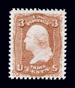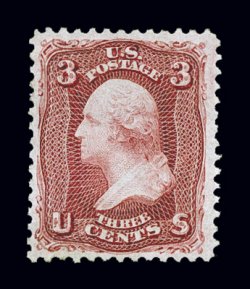 232 nh 65 var. image#65 var., 3c Brown red, well centered within lavishly large margins, bright fresh color in the scarce and distinctive brown red shade, immaculate o.g., never hinged, choice very fine; 2001 PF certificate and a 2005 PSE certificate (VF 80). (Image) for hinged $290.00
