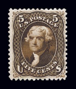 240 og 76 image#76, 5c Brown, deeply rich color and an excellent clarity of impression, better centering than normally found on this always difficult value, full o.g., lighlty hinged, very fine; 1987 PF (as #76a, dark brown) and a 2005 PSE certificate (F-VF 75). (Image) $1,600.00