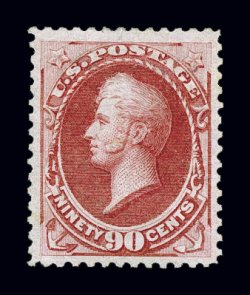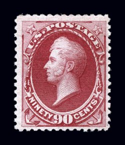 305 og 166 image#166, 90c Rose carmine, an extraordinarily choice mint example of this high value, featuring outstanding centering amid particularly large margins, brilliantly fresh color and a sharp impression, full o.g., relatively lightly hinged, extremely fine; a rare stamp in this select quality; 1984 and 1999 PF certificates, as well as a 2005 PSE certificate (XF 90). (Image) $2,750.00