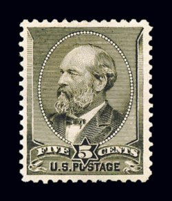 307 og 179 image#179, 5c Blue, a most impressive mint example of this surprisingly difficult stamp, possessing not only exceptional centering within very large margins, but its color is spectacularly deep and intense, with a prooflike impression as well, o.g., lightly hinged, extremely fine; 2002 PF certificate and a 2005 PSE certificate (XF 90). (Image) $750.00
