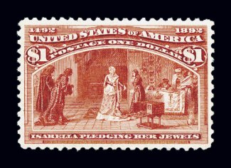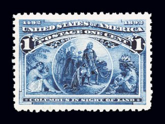 355 og 241 image#241, $1.00 Columbian, a handsome mint single that is particularly well centered, beautiful color that is strong and bright, well incised impression on fresh paper, o.g., lightly hinged, extremely fine; 1999 PF certificate and a 2005 PSE certificate (XF 90). (Image) $1,200.00