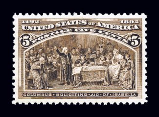 348 nh 234 image#234, 5c Columbian, marvelously well centered within large margins, sumptuously rich color and a particularly crisp impression on bright white paper, pristine o.g., n.h., extremely fine; an exceedingly choice gem; 2003 PSE certificate (XF-Superb 95). (Image) $195.00