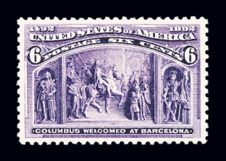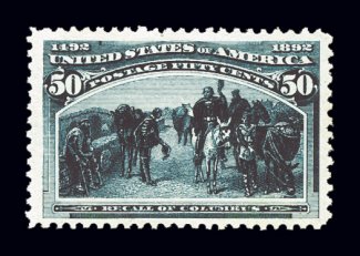 354 og 240 image#240, 50c Columbian, well centered within extra-large margins, deep intense color and impression, o.g., lightly hinged, choice very fine; 2005 PSE certificate (VF-XF 85). (Image) $600.00