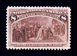 350 nh 236 image#236, 8c Columbian, extraordinarily well centered within uncharacteristically large margins, rich bright color on fresh paper, o.g., n.h., extremely fine; 2005 PSE certificate (XF 90). (Image) $175.00