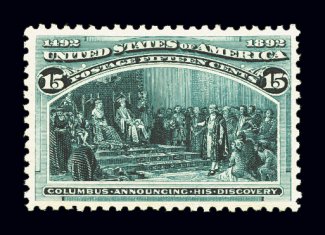 352 nh 238 image#238, 15c Columbian, uncharacteristically well centered, strong rich color and impression on bright paper, immaculate o.g., n.h., extremely fine and handsome; 2005 PSE certificate (XF 90). (Image) $625.00