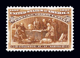 353 nh 239 image#239, 30c Columbian, exceptionally well centered within large margins, lovely rich color and a sharp impression on fresh white paper, o.g., n.h., extremely fine; 1995 PF certificate and a 2005 PSE certificate (VF-XF 85). (Image) $750.00
