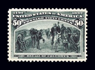 282 nh 240 image#240, 50c Columbian, intensely rich color and a razor-sharp impression, nicely centered and margined, o.g., n.h., choice very fine; premium quality never hinged examples of this stamp are few and far between; 2003 PF certificate. (Image) $1,700.00
