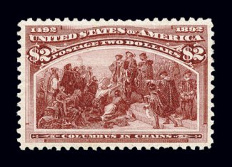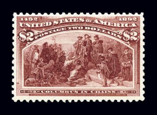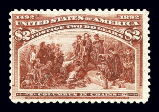 287 nh 242 image#242, $2.00 Columbian, gorgeous color that is remarkably bright and rich, highly detailed impression, well centered, pristine o.g., n.h., very fine; one of the few truly "post office" fresh never hinged Two Dollar Columbians we have ever offered; 1992 and 2002 PF certificates. (Image) $3,650.00