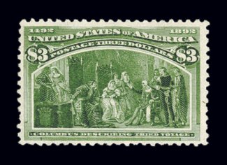 291 og 243a image#243a, $3.00 Columbian, the olive green shade, well centered, intensely rich color in the olive green shade, o.g., tiny perf. thin at top, choice very fine appearance; 1995 PF certificate. (Image) $1,900.00