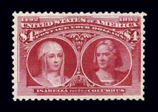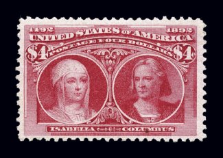 292 og 244 image#244, $4.00 Columbian, a select mint single of this value, possessing exceptional centering within large margins, plus its color is brilliant and fresh, prooflike impression on bright white paper, full o.g., lightly hinged, extremely fine and a very pretty example of this key high value; 1989 PF certificate; ex-McCree. (Image) $2,600.00