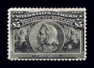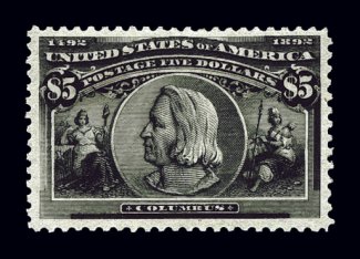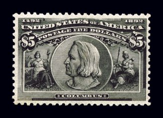 296 og 245 image#245, $5.00 Columbian, a rather handsome and wonderfully bright mint example of this popular high value commemorative, possessing deep intense color and a well incised impression on fresh paper, well centered within uncharacteristically large margins, full clean o.g., lightly hinged, choice very fine; 2000 PSE certificate (VF-XF 88). (Image) $3,000.00
