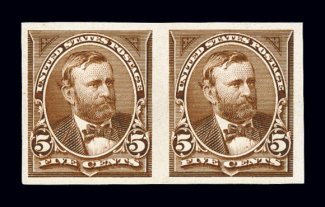 310 og 255b image#255b, 5c Chocolate, imperforate, horizontal pair, large margins all around, strong rich color, o.g., lightly hinged, choice very fine; 2000 PF certificate for a block of four, this being the bottom pair. (Image) $300.00