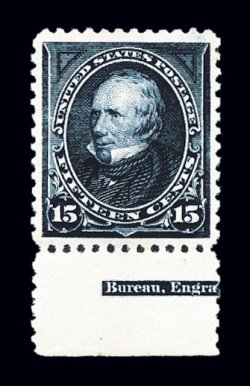 313 nh 259 image#259, 15c Dark blue, an extraordinarily handsome and choice bottom margin partial imprint single, in a condition not often encountered, featuring unusually large and marvelously well balanced margins all around, incredibly fresh, with intense prooflike color and impression, pristine o.g., n.h., there is just a trace of a faint horizontal bend which is not even called on the accompanying certificates, extremely fine and striking; photocopy of a clear 1979 PF certificate for an imprint and plate number strip of three from which this stamp was taken, as well as a clear 2006 PF certificate for the single. (Image) $850.00