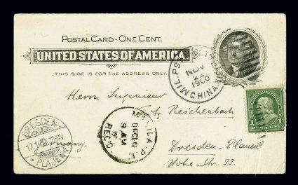 341 c 279 image#279, 1c Deep green, tied to 1c Jefferson postal card, used in China during the Boxer rebelion with "Mil. P Sta. No. 1, Tientsin/ China/Nov 22, 1900" duplex, posted to Germany with Manila, Philippines duplex, backstamped Dresden, light crease to card slightly affecting 1c Green with corner fault, attractive and scarce usage. (Image) Est. 150-200