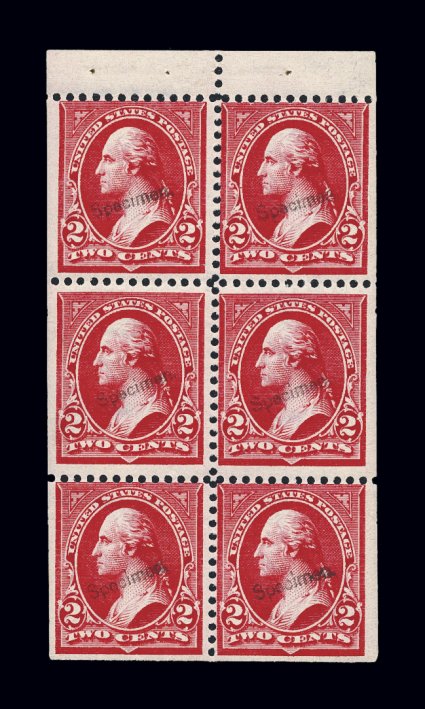 342 BPS 279BeS image#279BeS, 2c Light red, booklet pane of six, with "Specimen" ovpt., deep vibrant color, o.g., lightly hinged, fine-very fine; a seldom offered booklet pane specimen. (Image) $525.00