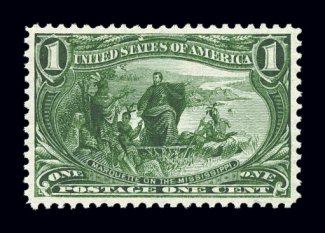 349 nh 285 image#285, 1c Trans-Mississippi, exceptional mint single, remarkably intense rich color and a razor-sharp impression, large wonderfully well balanced margins all around, o.g., n.h., extremely fine; an immaculate gem; 1995 PSE certificate (XF-Superb 95). (Image) $70.00