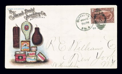 350 c 286 image#286, 2c Trans-Mississippi, single tied by Buffalo, N.Y., Jun 6, 1899 duplex on multicolored advertising cover of Jacob Dold Packing Co., with advertising on the back, sent to New York City (backstamp), very fine and quite attractive. (Image) Est. 150-200
