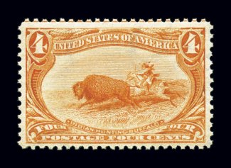 356 nh 290 image#290, 10c Trans-Mississippi, an eye-catching mint single, possessing extraordinarily large and precisely balanced margins all around, plus its color is especially rich and luxuriant, while its impression is razor sharp on bright white paper, o.g., n.h., small natural gum wrinkle mentioned only for strict accuracy (and not even mentioned on the accompanying certificate), an extremely fine large-margined gem; clear 1992 PF certificate. (Image) $425.00