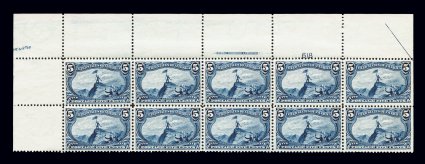 353 ogPB 288 image#288, 5c Trans-Mississippi, a magnificent full top left corner margin partial arrow, imprint and plate no. 618 block of ten, being the full top two rows of the sheet boasting extra-wide sheet selvage on both sides, wonderfully preserved in outstanding condition for this very scarce plate block, possessing impressively fresh deep color and a prooflike impression on bright paper, however most incredible is its exceptional centering and margins throughout, strong and intact perforations which is the rare exception for this series, immaculate o.g., lightly hinged in the bottom right pair just catching one stamp in the plate block of six and in the non-plate bottom left stamp, the other seven stamps are never hinged with flawless o.g., extremely fine; a visually stunning Five Cent Trans-Mississippi plate block; woefully undercataloged, as ten hinged and never hinged singles total $2695.00. (Image) $2,330.00