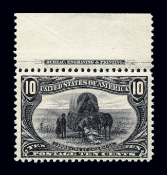 357 nh 290 image#290, 10c Trans-Mississippi, top margin imprint single, brilliantly fresh and crisp, sumptuously rich color and a razor-sharp impression, well centered, immaculate o.g., n.h., a very fine and choice mint single; 2004 PSE certificate for a pair, this being the left stamp. (Image) $425.00