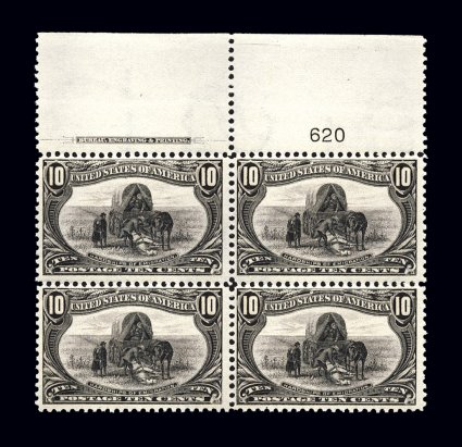 358 ogPB 290 image#290, 10c Trans-Mississippi, attractive full top margin imprint and plate no. 620 block of four, especially fresh color and a sharp detailed impression on bright paper, intact perforations, overall quite well centered for this difficult value, o.g., lightly hinged in bottom pair, top pair n.h., a very fine and choice plate block. (Image) $1,900.00